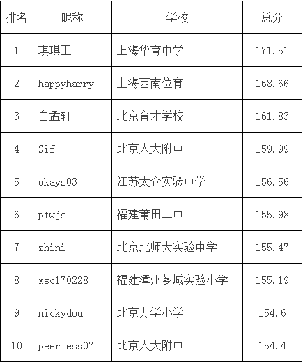 经过12轮的激烈角逐,来自上海华育中学的琪琪王同学力克群雄,获得第一届全国中小学生网络桥牌个人赛的第一名,来自上海西南位育的happyharry同学获得第二名,来自北京育才学校的白孟轩同学获得第三名。获得前十名的选手是: