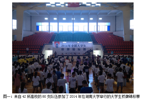 今年7月21-27日,在长沙湖南大学举行了大学生桥牌锦标赛,有来自42所高校的80支队伍参加了比赛。这是历史上参赛学校最多的一次,也显示了桥牌进校园工作举得了阶段性的成果。